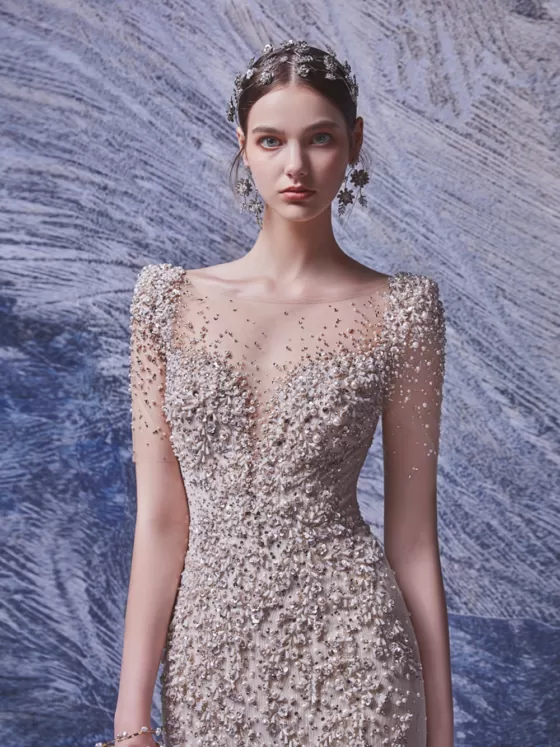 The glittering mermaid dress is embroidered overlay the dress with luxury Swarovski crystal hotfix making elegance, alluring