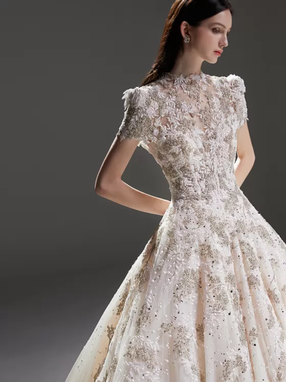 Immerse in the delicate, elegance of minimalist princess gown with glittering Swarovski crystal have been made by masterful handcraft couture