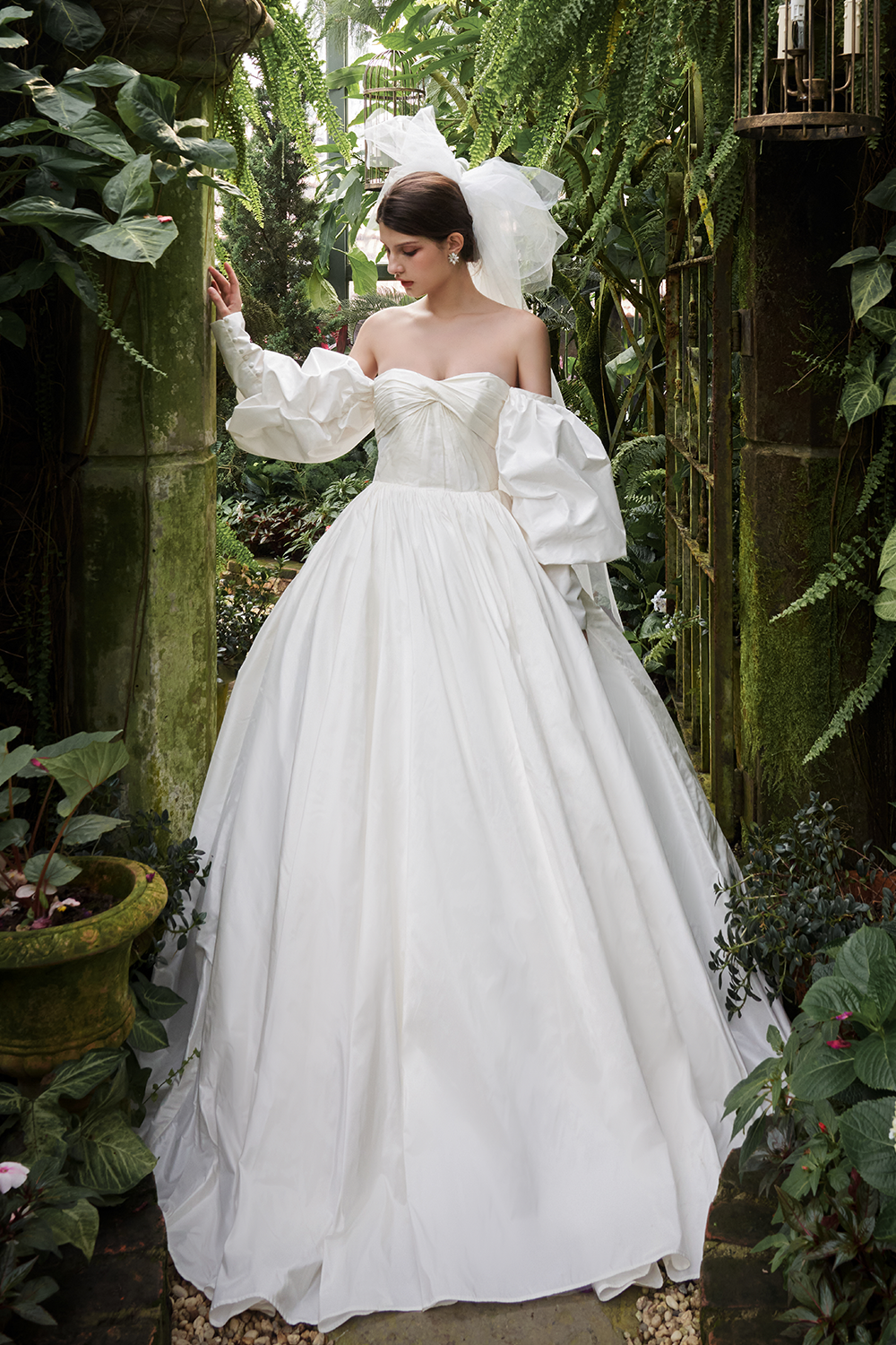 The combination of a puff sleeve design inspired by classic style, and romanticism by long off-shoulder silk taffeta.